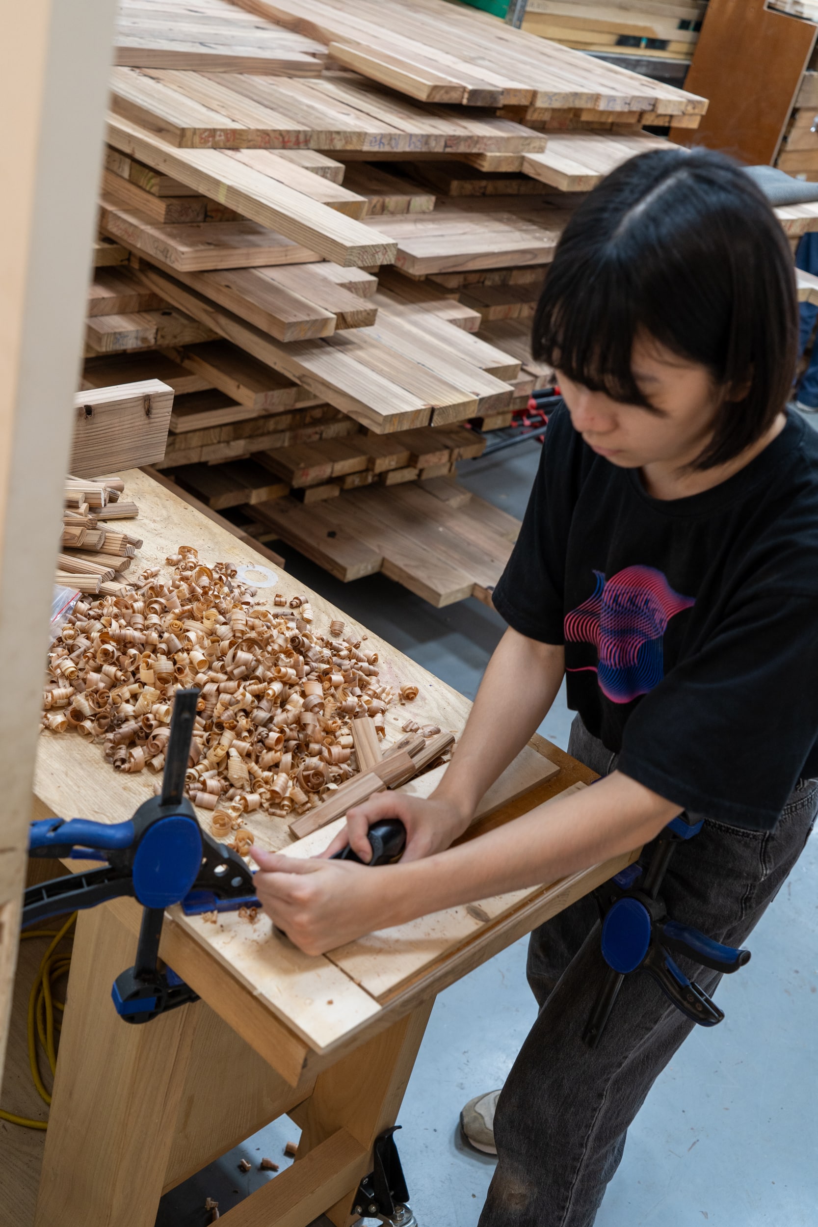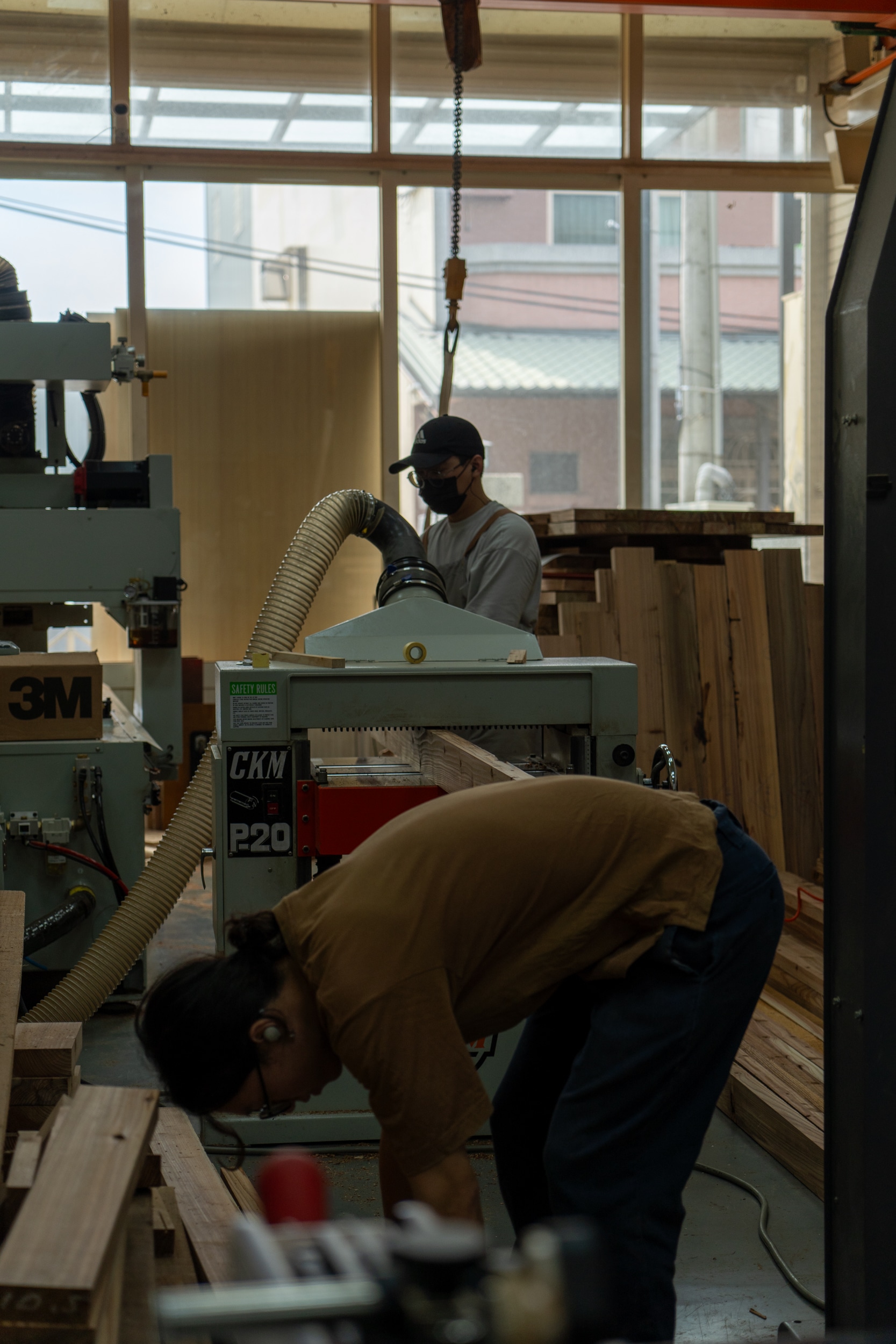 記得當時看到柴屋的實習生招募貼文中有寫到一句話:「木作的環境通常很枯燥。」,不過因為我很喜歡沉浸於做某件事當下的氛圍和感覺,所以與其說用枯燥形容,我反而覺得木作使我專注和安定。那種「進入」的當下就像是聽不見周遭各種機器和集塵產生的噪音,世界在一瞬間都靜音了,只剩下木頭和我。